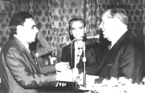 Na foto, o Senador Ernani do Amaral Peixoto recebe das mãos do vereador Augusto César Trigueiro o título de Cidadão Iguaçuano, assistido pelo deputado estadual Antonio Gaspar. (Foto do arquivo do Instituto Histórico e Geográfico de Nova Iguaçu)